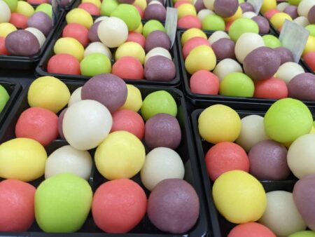 旧暦の2月15日(新暦3月31日)のお釈迦様の命日に行われる法要「涅槃会(ねはんえ)」で参拝者に配られるお団子のこと。その団子はお釈迦様の舎利(ご遺骨)に例えられ、無病息災や交通安全、厄除けなどにご利益があるとされています。団子の5色は、仏教でいうところの五大(地水火風空)を表している。